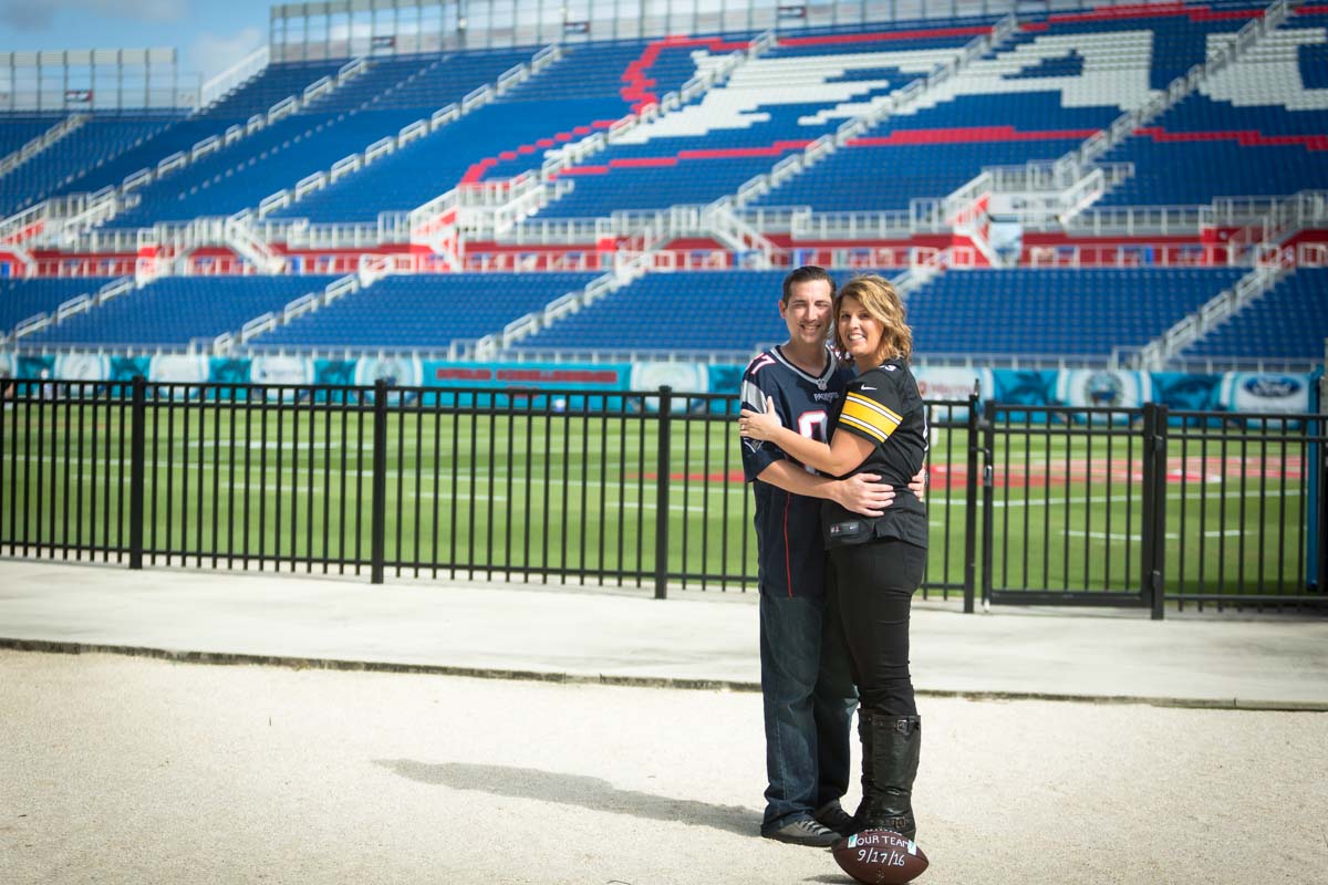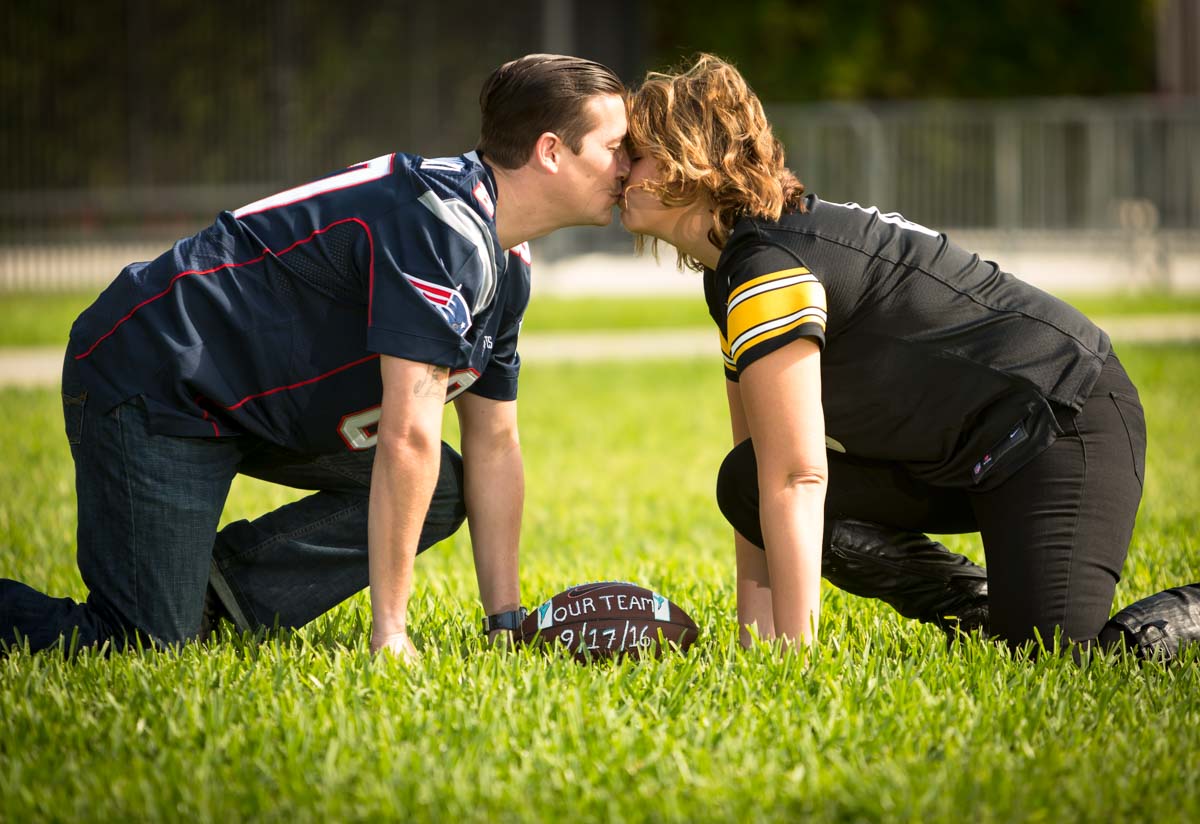 Crystal and Eric are huge football fans and as part of their Boca Raton Engagement Photography wanted to display their love of the game and their teams. Crystal is a Steelers fan and Eric is a Patriots fan, so we created some fun playful images with football and their love for the game and each other as the centerpiece. We began Crystal and Eric’s Boca Raton Engagement Photography session started with easy natural poses then progressed to more playful photojournalistic images.